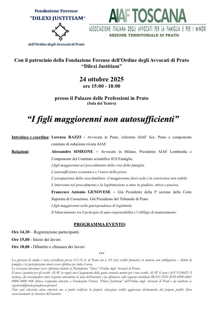 La giornata di studio è stata accreditata presso i l C O A di Prato con n. 3 tre ) crediti formativi in materia non obbligatoria diritto di famiglia e la partecipazione dovrà essere effettiva per tutto il corso.