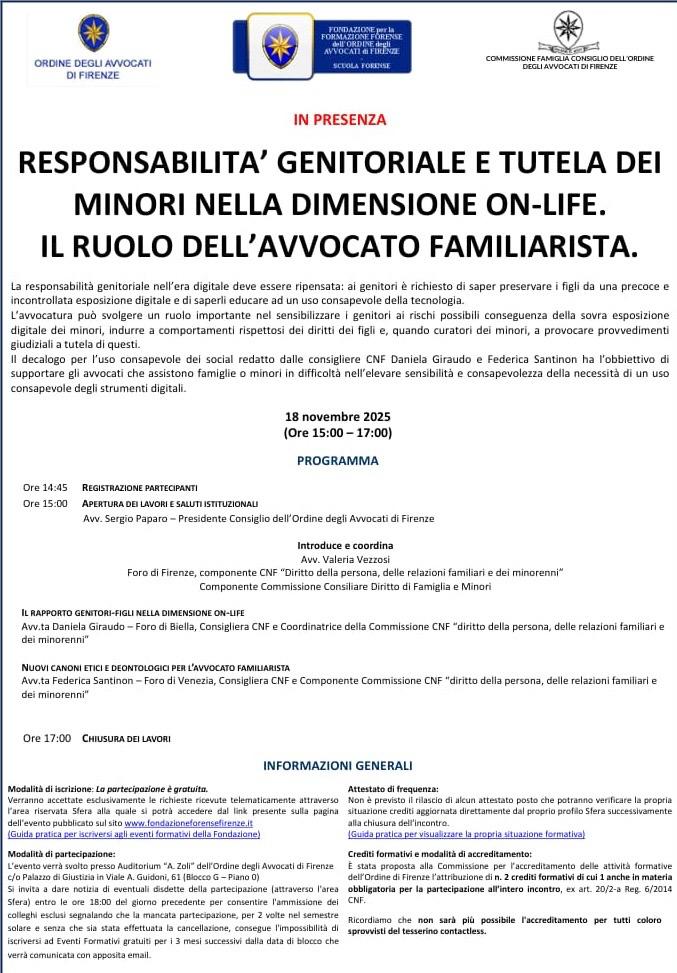 Modalità di partecipazione: L’evento verrà svolto presso Auditorium “A. Zoli” dell’Ordine degli Avvocati di Firenze c/o Palazzo di Giustizia in Viale A. Guidoni, 61 (Blocco G – Piano 0) Si invita a dare notizia di eventuali disdette della partecipazione (attraverso l'area Sfera) entro le ore 18:00 del giorno precedente per consentire l'ammissione dei colleghi esclusi segnalando che la mancata partecipazione, per 2 volte nel semestre solare e senza che sia stata effettuata la cancellazione, consegue l'impossibilità di iscriversi ad Eventi Formativi gratuiti per i 3 mesi successivi dalla data di blocco che verrà comunicata con apposita email.
